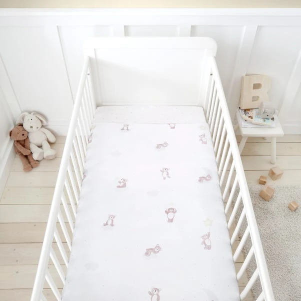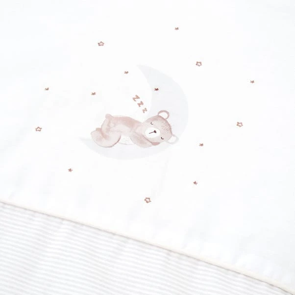 Boasting a beary cute baby bear print, this coverless cot quilt is the perfect addition to your little one’s bed. Sporting a 4 tog thickness with a polyester fibre filling, this quilt is lightweight, whilst remaining soft and cosy. Crafted from 100% cotton, the cover is naturally breathable and easy to care for, leaving no need to faff around fitting a duvet cover. Additionally, this quilt features a reversible design so your little one can enjoy two designs in one. Coordinating fitted sheets, duvet cover and pillowcase sets available to purchase separately.