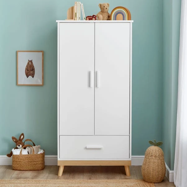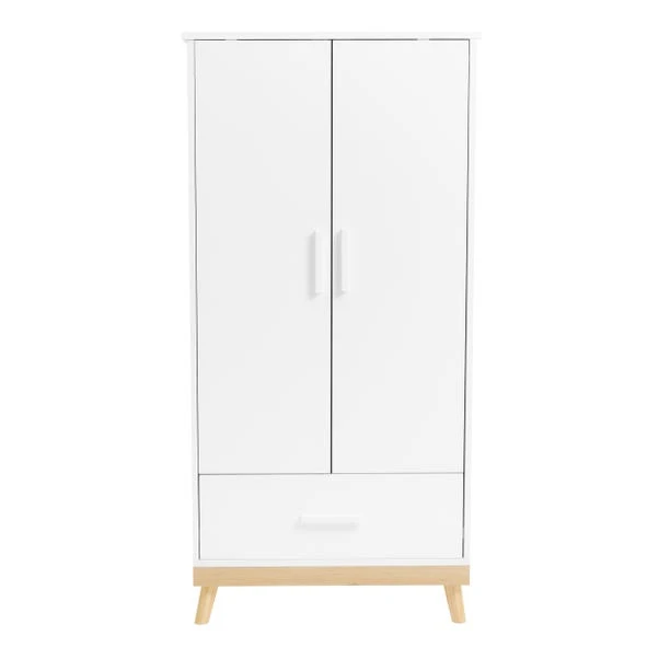 This wardrobe is designed to maximise storage with a practical layout that includes a drawer and two hanging rails. The minimalist design allows the wardrobe to seamlessly integrate into your nursery, adding both storage capacity and style. The drawer provides extra space for smaller items, while the hanging rails are ideal for baby clothes.