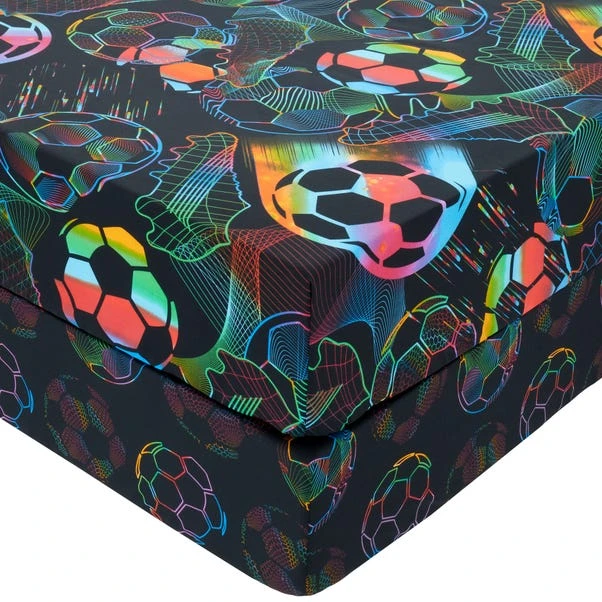 Kick off bedtime with our Bright Football Fitted Sheet, perfect for young sports enthusiasts. Featuring a modern sporty design, this sheet adds a playful touch to any football fan’s bedroom. Crafted from a breathable polycotton blend, it’s easy to care for and provides lasting comfort. Featuring two stylish looks in one pack, while the machine-washable fabric ensures hassle-free cleaning. Matching items are also available to complete the sporty bedroom makeover.