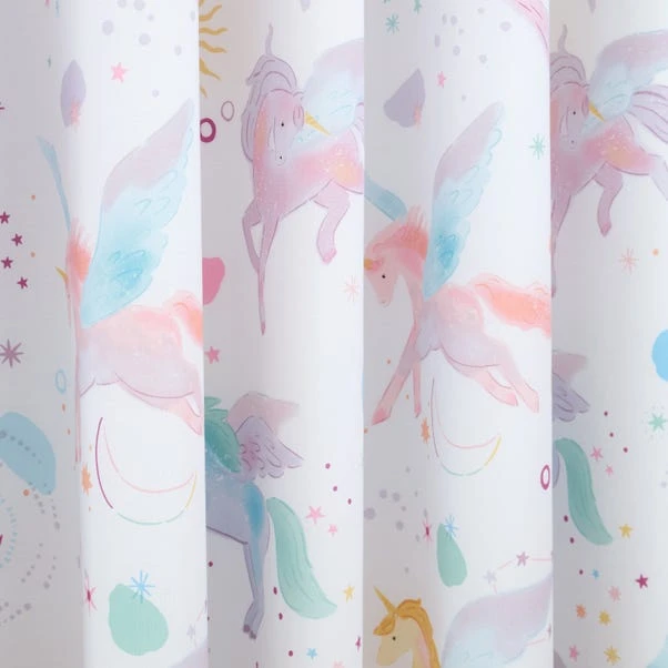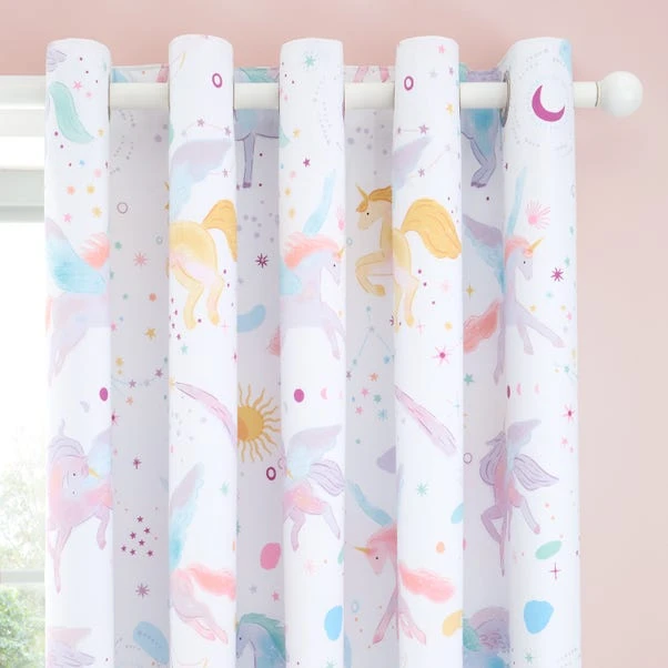 Bring a touch of magic to your child’s room with our Celestial Unicorn Curtains. Featuring a dreamy unicorn design on a soft polycotton fabric, these curtains add an enchanting charm to any space. With a blackout lining, they block out unwanted light for a restful night’s sleep. The eyelet header allows for easy hanging, and the set includes matching tiebacks for a polished finish. Complete the magical look with corresponding items available in the collection.