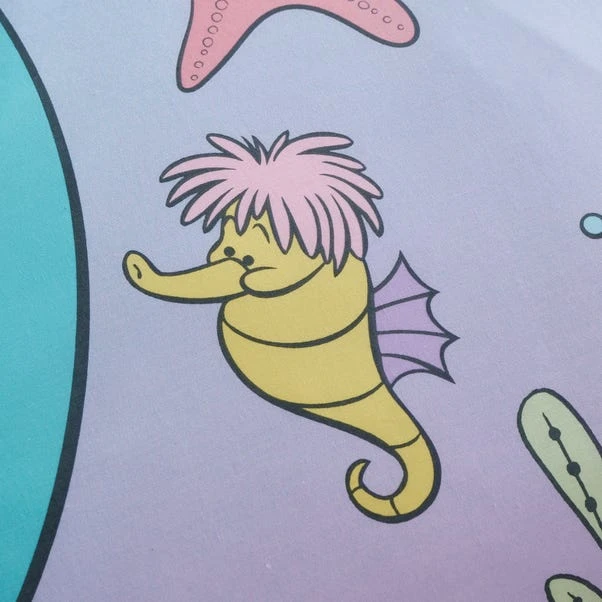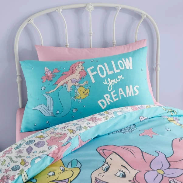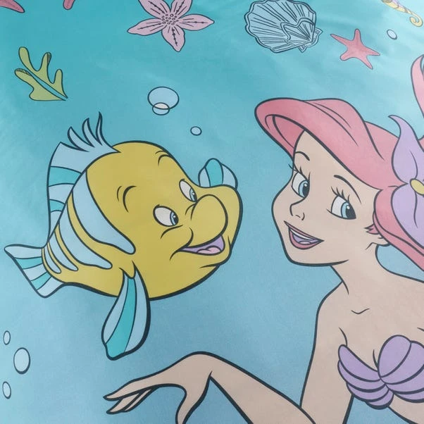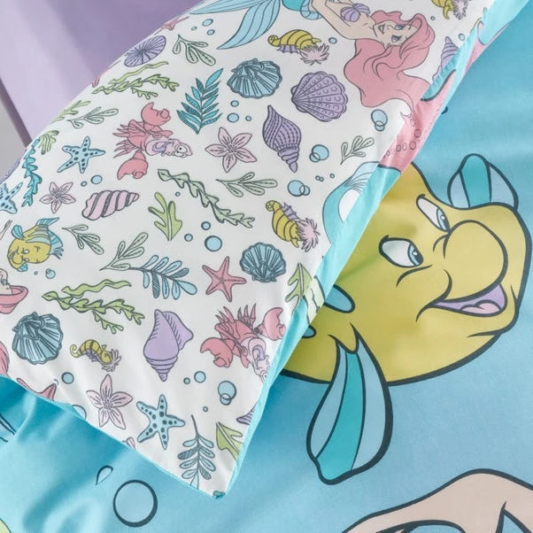 Give your little mermaid lover a peaceful night sleep with our Disney The Little Mermaid duvet cover and pillowcase set. Crafted from a soft blend of recycled polycotton which is machine washable for convenient cleaning. Designed with a reversible style, with Ariel under the sea print on one side and colourful seashells print on the reverse, so you can choose which side you prefer. It comes complete with a matching pillowcase and is finished with a secure button closure.