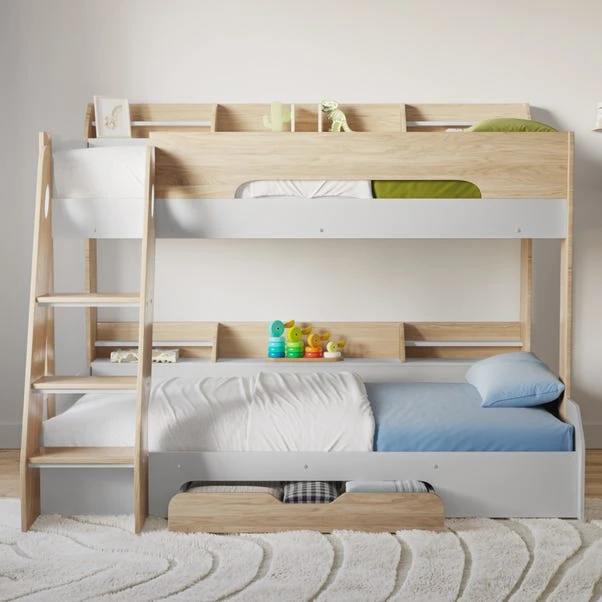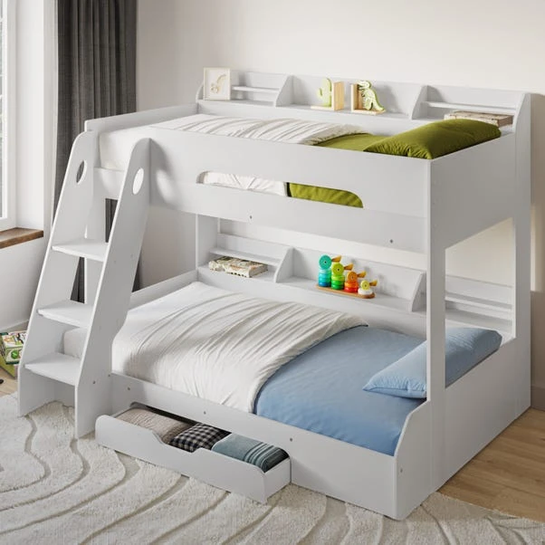 This bed cleverly combines a small double mattress on the lower bunk with a single mattress on the top, allowing up to three individuals to sleep comfortably while maximising floor space. This stylish bunk bed is not only perfect for smaller bedrooms but also complements various other furniture pieces due to its blend of traditional and modern design elements. Safety is a key feature, with raised side panelling and high headboards and footboards on the top bunk. Designed with practicality in mind, it features full-length shelving on both bunks and a spacious under-bed drawer on wheels with a cut-out handle for easy access.