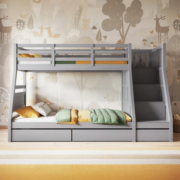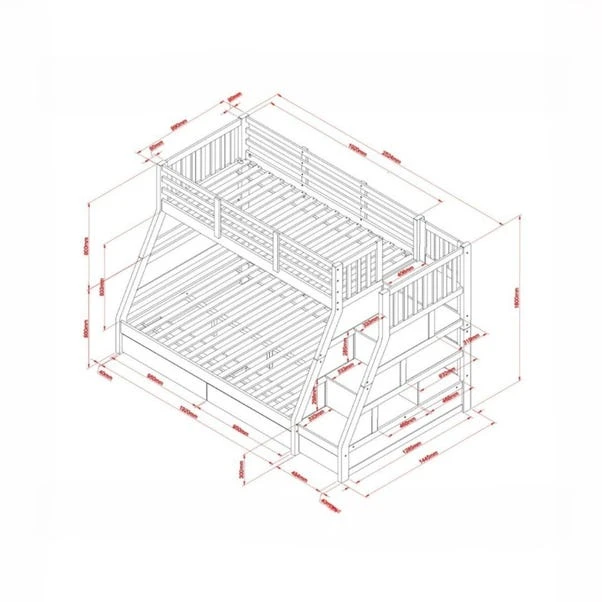 This sophisticated design incorporates a host of valuable features to enhance both functionality and safety. It includes three spacious under-bed drawers, ideal for storing clothes, toys, and other essentials. These drawers are mounted on wheels for easy access and smooth operation, avoiding the common issue of drawers getting stuck. In addition to ample storage, the Lunar Triple features wide-stepped stairs designed to prioritise safety. This thoughtful design ensures that children can easily and securely access the top bunk, minimising the risk of accidents during morning routines.