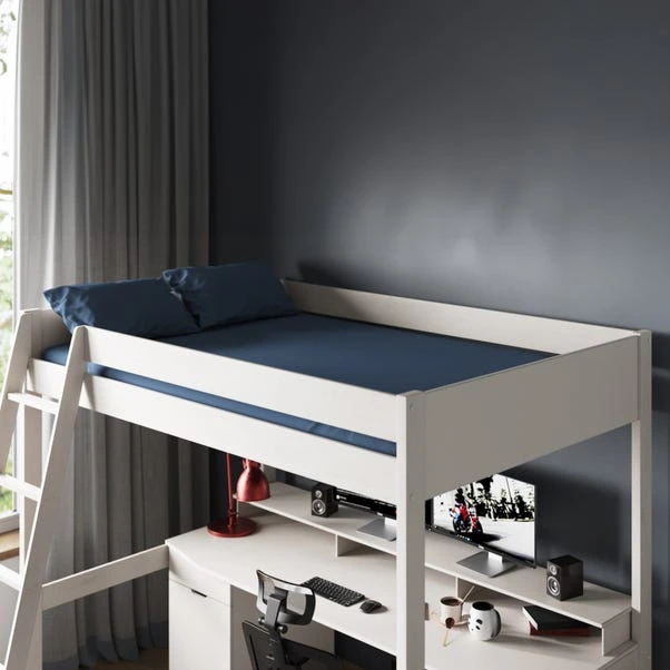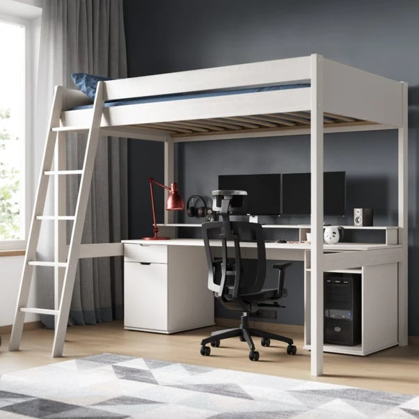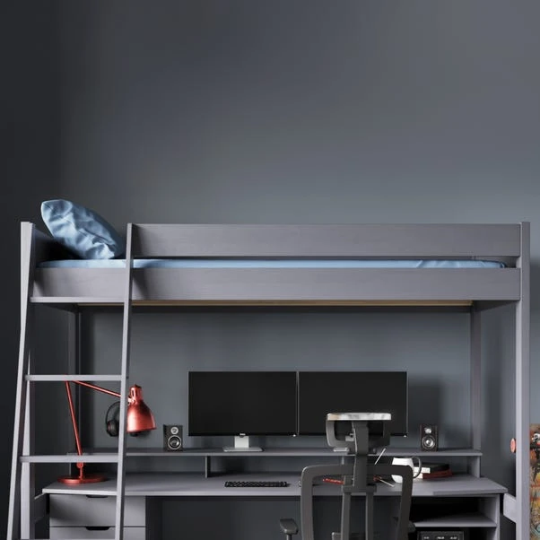 This bed frame is designed to optimise space and functionality in compact bedrooms. This high sleeper features a generous under-bed area with an integrated gaming desk, offering an ideal setup for gaming enthusiasts. The bed comes in either single or small double including ample storage solutions, with a built-in MDF desk for a dedicated work or gaming area.