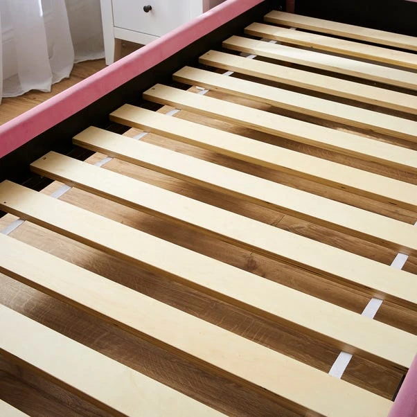 Designed for both comfort and durability, this bed frame is crafted with a sturdy wooden frame and durable wooden legs, providing reliable support for years to come. The curved cushioned headboard offers a touch of elegance and ensures a comfortable and safe sleeping environment. With its robust wooden slats, this bed frame guarantees excellent mattress support, promoting a restful and rejuvenating night’s sleep for your child.