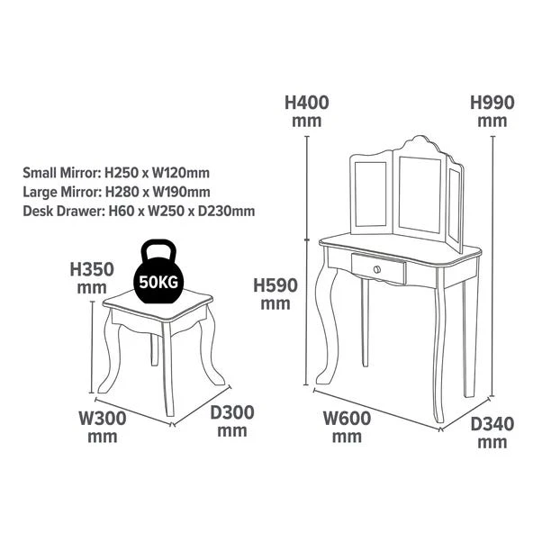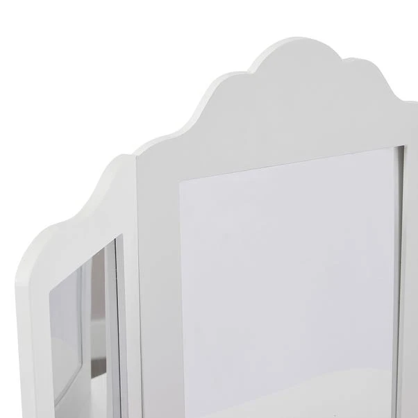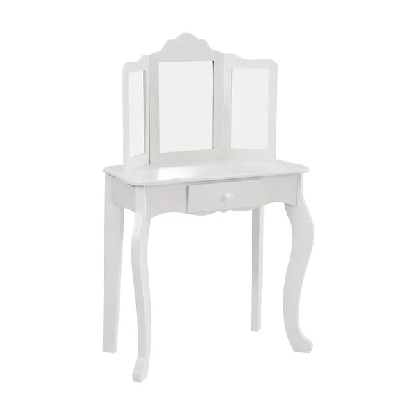 This vanity table and stool set is perfect for playing dress-up and unleashing your child’s imagination. With toughened safety glass mirrors, the three mirrors provide a full panoramic view for grooming, applying make-up, or doing hair, ensuring your child stays safe. It features a large central pull-out drawer, ideal for storing make-up, brushes, jewellery, and other accessories all in one easily accessible place.