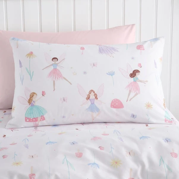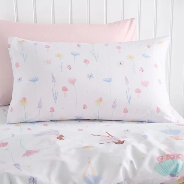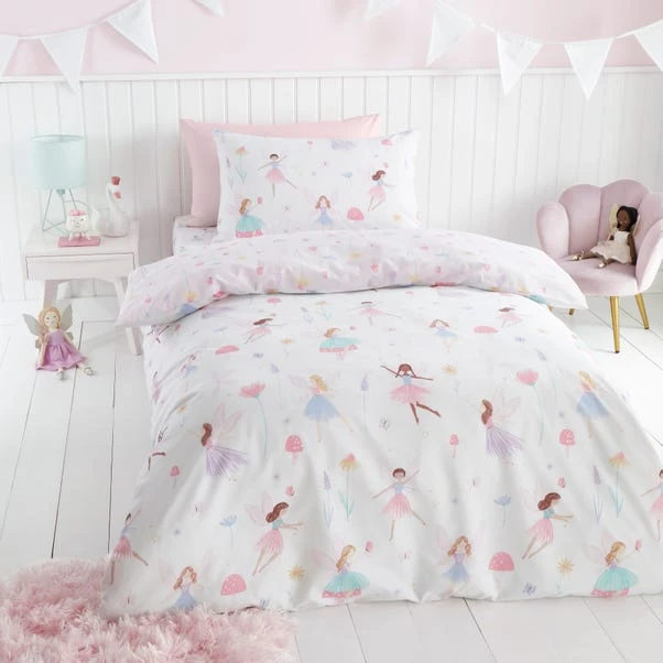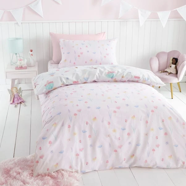 Add a fairy touch to your little ones bedding with this pretty Meadow Fairies duvet cover and pillowcase set. Crafted from recycled polycotton in a 144 thread count which is machine washable for easy cleaning. Designed in reversible print, so your child can enjoy two patterns in one. It comes complete with matching pillowcase(s) and is finished with a secure button closure for a dreamy night sleep. Coordinating fitted sheets are also available to purchase separately.