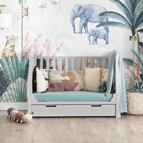 With a compact design, this Stamford mini cot bed is perfect for a smaller nursery space. The cot includes an under drawer that provides you with extra storage space for your baby essentials. As your baby grows, you can lower the mattress base to accommodate their changes. When they are old enough, you can remove the sides to transform the cot into a toddler bed. The sleigh design coordinates beautifully with any nursery theme you have chosen and the rest of the Stamford range. Choose between colour options to find the best colourway to suit your nursery theme.