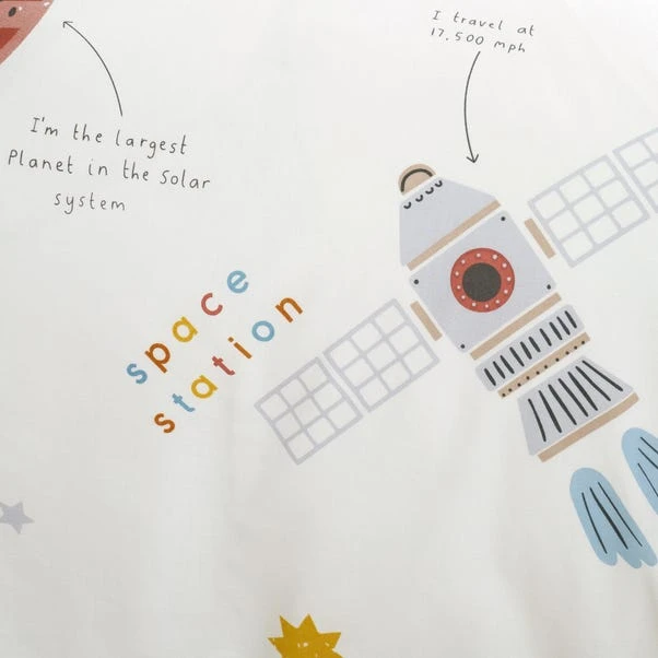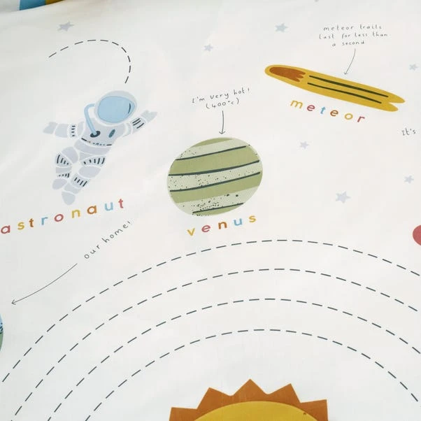 This duvet cover is out of this world! Showcasing our solar system, this duvet cover and pillowcase set is powered by fun. Crafted from a polycotton material, the set is easy to care for and is fully machine washable. The duvet cover set has been finished with a button closure which helps secure the cover around the duvet whilst in use. Pair the duvet cover with the matching fitted sheets and bedspread for a spectacular look.