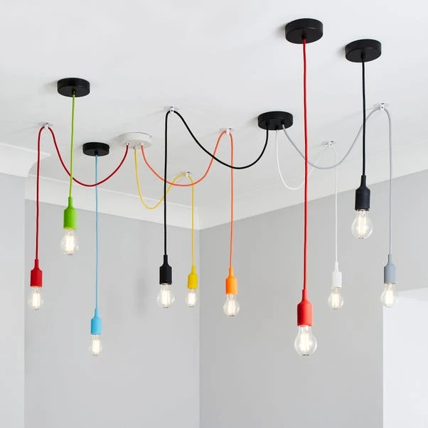 Bring a fun, colourful feel to any room with the 1 Light flex ceiling fitting, perfect for kids rooms. Perfect for use with statement bulbs for a trendy look, this light fitting features height adjustable silicon rubber flex cable and is dimmable compatible with a suitable bulb and dimmer light switch.
