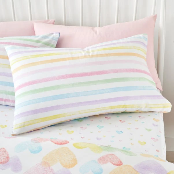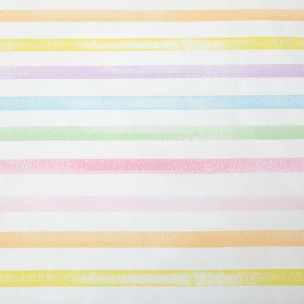 Add some extra love to your child’s bedroom with this Rainbow Hearts duvet cover and pillowcase set. Crafted from a soft and cosy blend of recycled polycotton in a 144 thread count which is machine washable for convenient cleaning. Designed in a reversible style with a rainbow hearts print on one side and a rainbow stripe print on the other, giving you the option to switch between the two whenever you desire. It comes complete with a matching reversible pillowcase and is finished with a secure button fastening for an uninterrupted night sleep. Pair this set with the coordinating fitted sheets available.